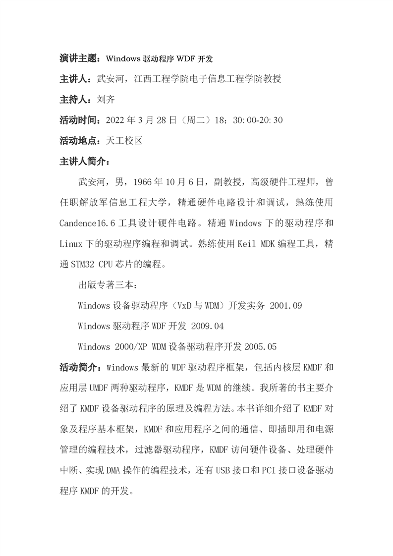 【学术通知】BB贝博艾弗森教授武安河学术讲座:Windows驱动程序WDF开发