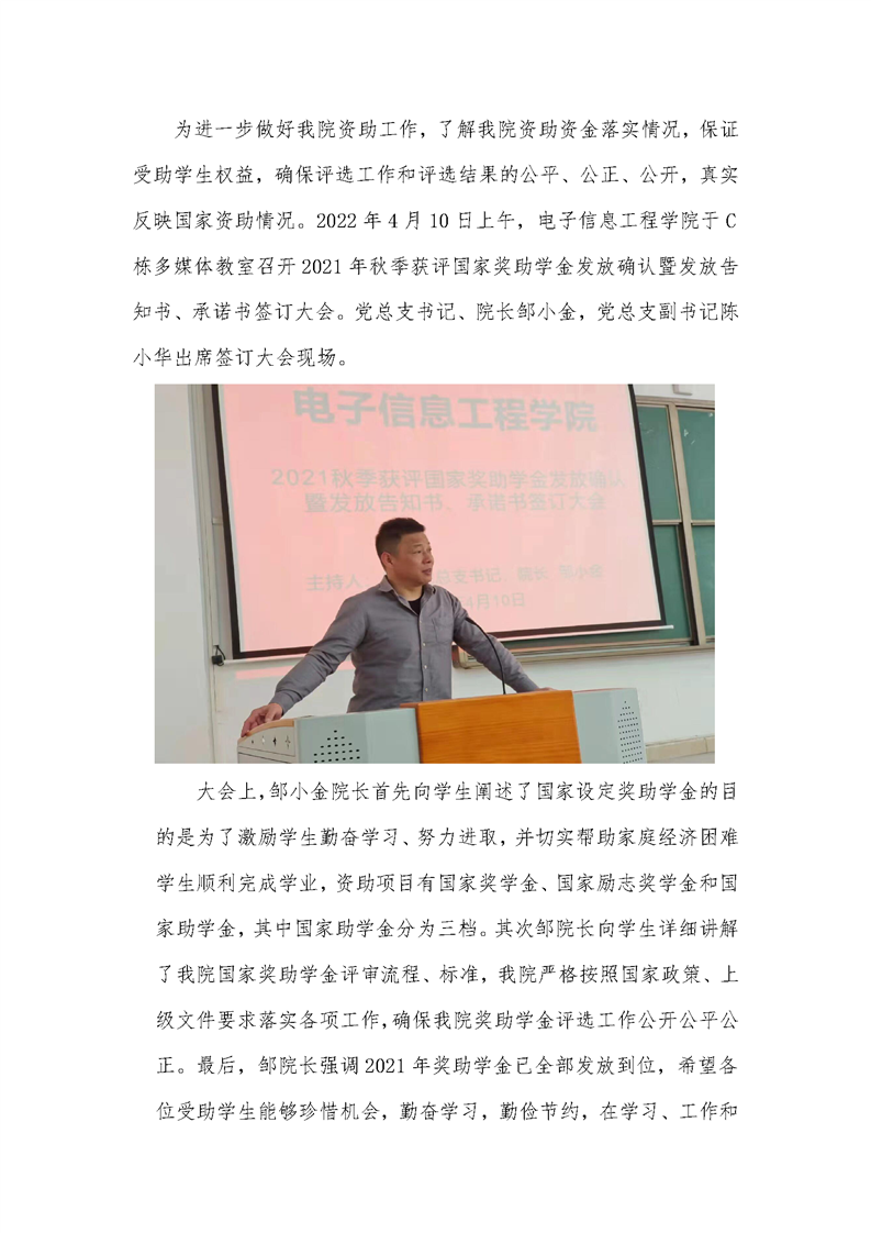 公司召开2021年秋季获评国家奖助学金发放确认 暨发放告知书、承诺书签订大会