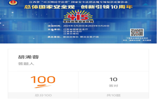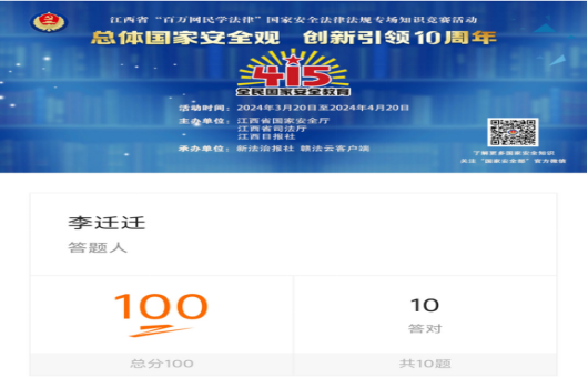 江西省平安办充分利用现代科技手段,在赣法云客户端专门开设了“云端学法”专栏,为此次知识竞赛提供了便捷、高效的学习平台。这一创新举措极大地激发了同学们的学习热情,他们纷纷下载“赣法云”APP,通过线上学习,对《江西省平安建设条例》进行了广泛宣传、深入解读和及时贯彻。老师、同学们在学习的过程中,不仅提升了自身的法治素养,也增强了参与平安建设的责任感和使命感。